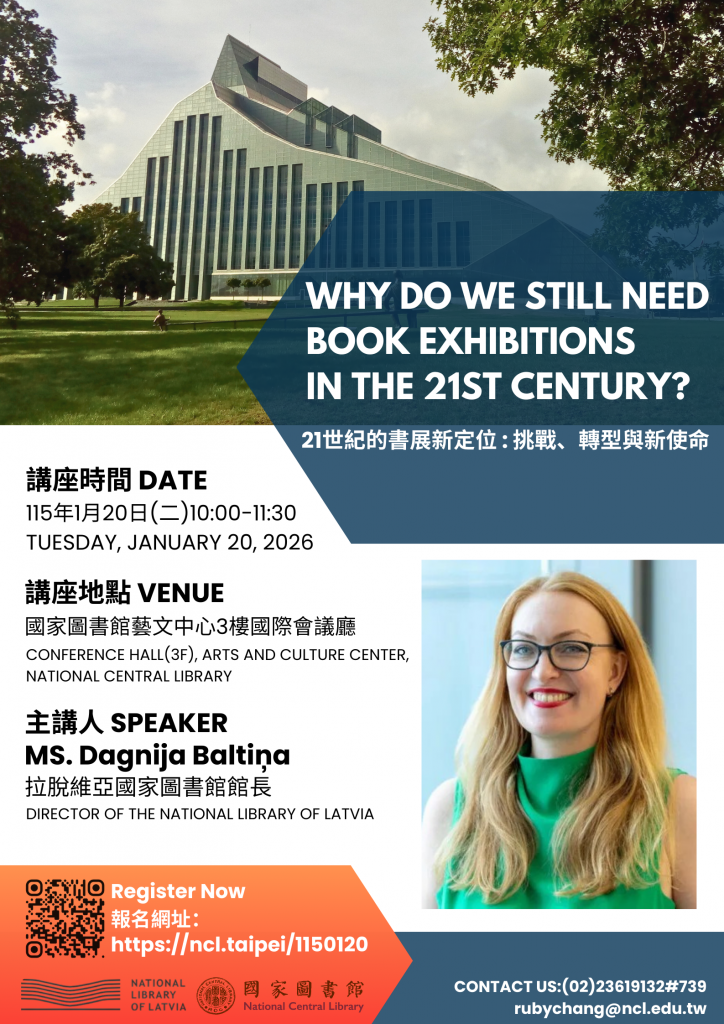 內容:21世紀的書展是圖書館主動推廣知識與研究成果的關鍵媒介,扮演著文化外交的柔性力量角色,Ms. Dagnija Baltiņa館長將分享該館歷年書展案例,並說明其策展理念、展覽規劃與執行以及對策展方法的紀錄與分析。