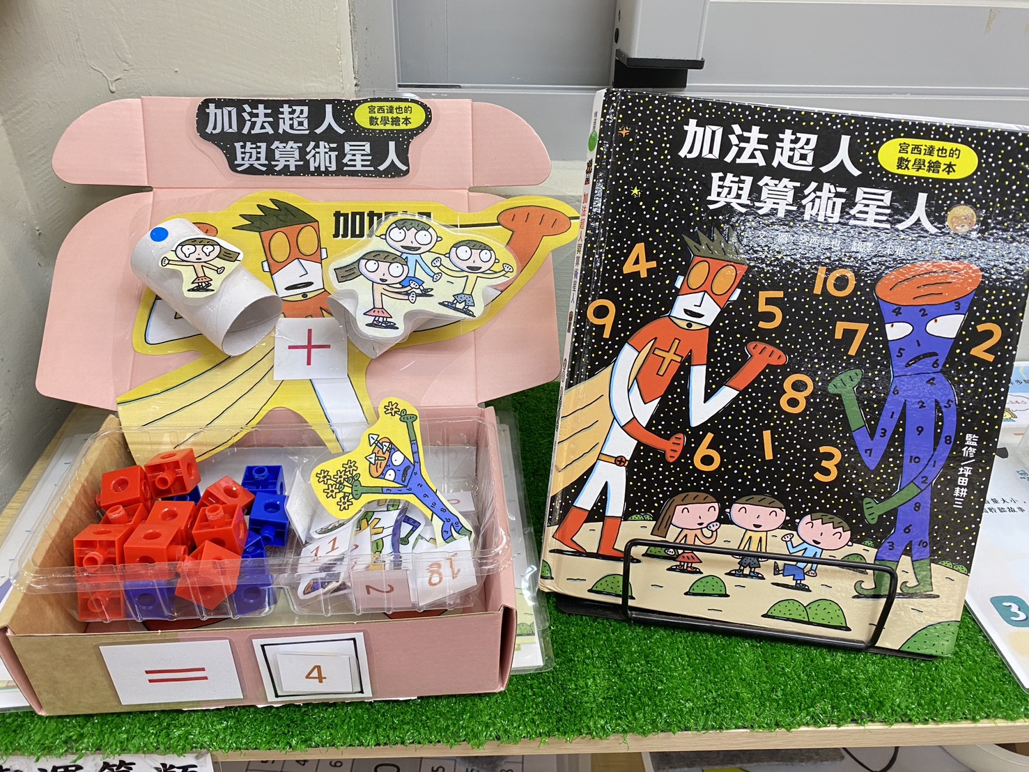 運用餅乾盒當作遊戲寶盒,將故事內容印出剪下部分角色,並用衛生紙捲當作管子,左右2側可以用數字或是角色做加法練習,並可以用智高積木對應積木數量進行加總,最後將等號右側貼上加總的數量,可以配合故事內容學習加法,也可以自由抽籤加總,圖案豐富又有趣。