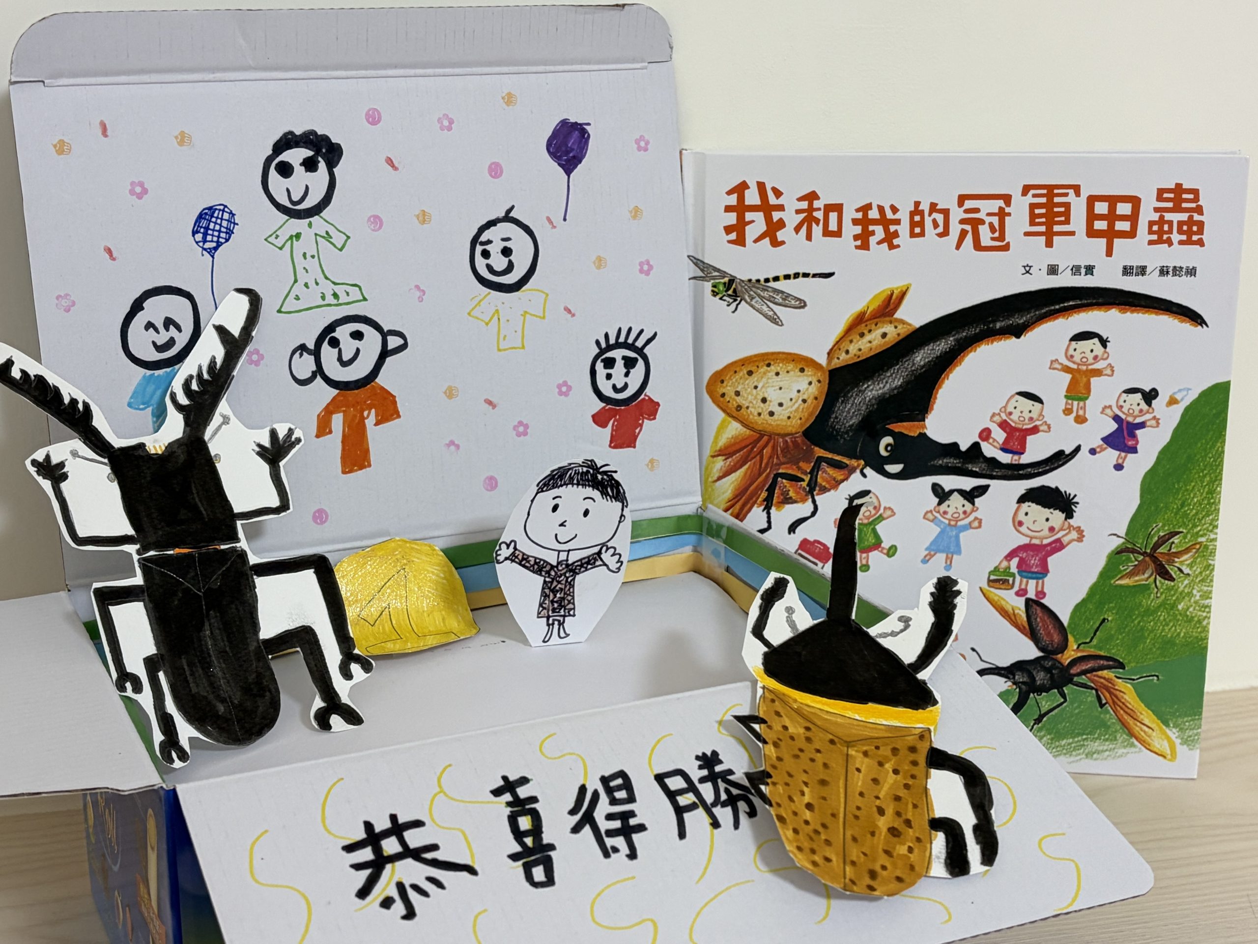 利用空紙盒做昆蟲比賽擂台,過期雜誌紙當作擂台裝飾,以紙甲蟲來演示冠軍甲蟲的故事。