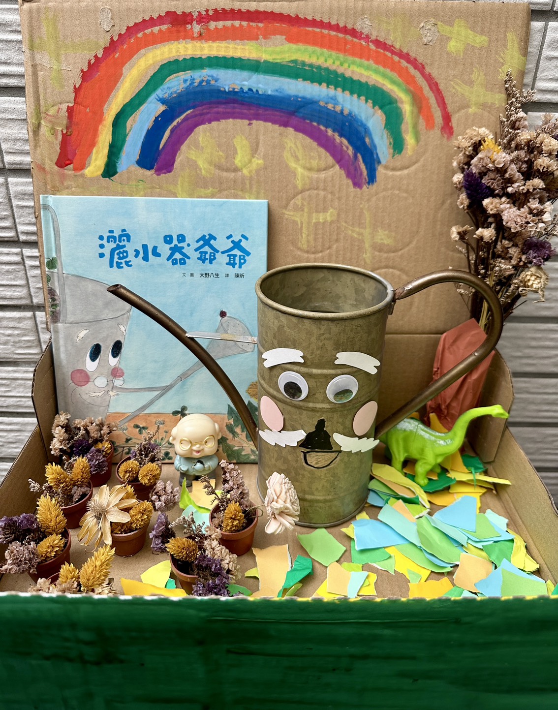 運用乾燥花卉、老舊生鏽的澆花器與廢紙張,打造一座可移動的行動故事屋。透過舊物與自然素材的結合,重現花園靜靜生長的溫柔時光,也讓故事在孩子眼前慢慢展開。作品傳遞對生命的珍惜、對土地的關懷,以及在平凡日常中發現美好的力量。