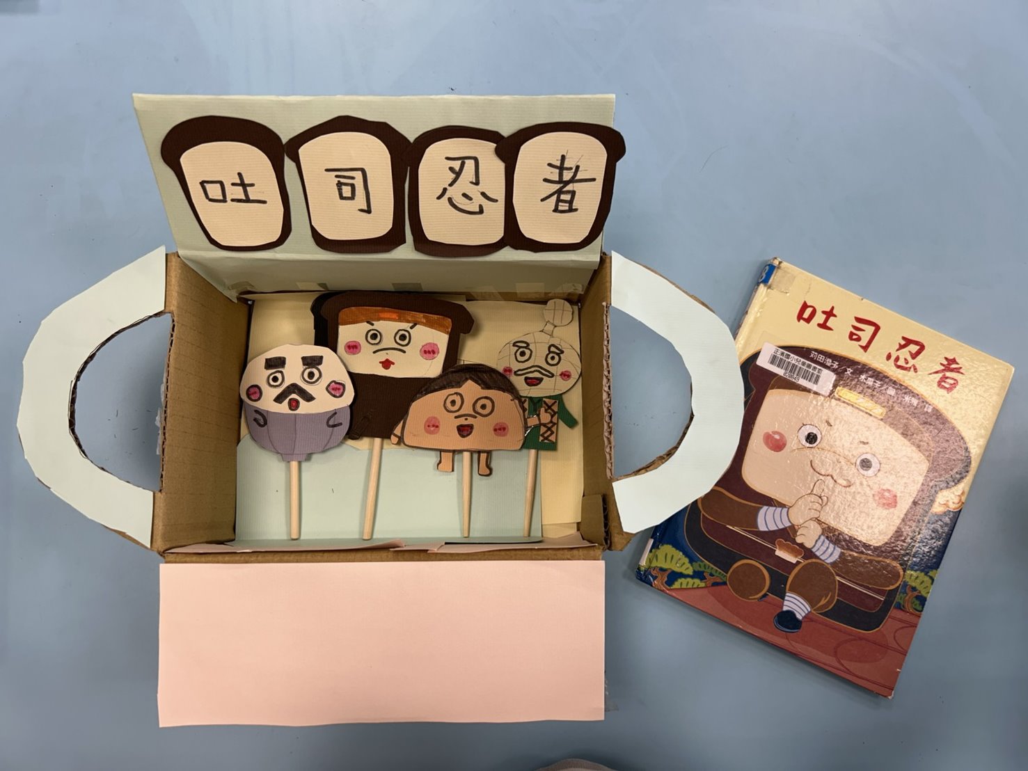 我用寄包裹後廢棄的紙盒子,做成吐司忍者故事盒。然後再用剩下的色紙和一雙回收竹筷子,做出吐司忍者、波羅麵包大人、米飯大人和米飯大人的孫子,然後就可以開始表演精彩的故事了!