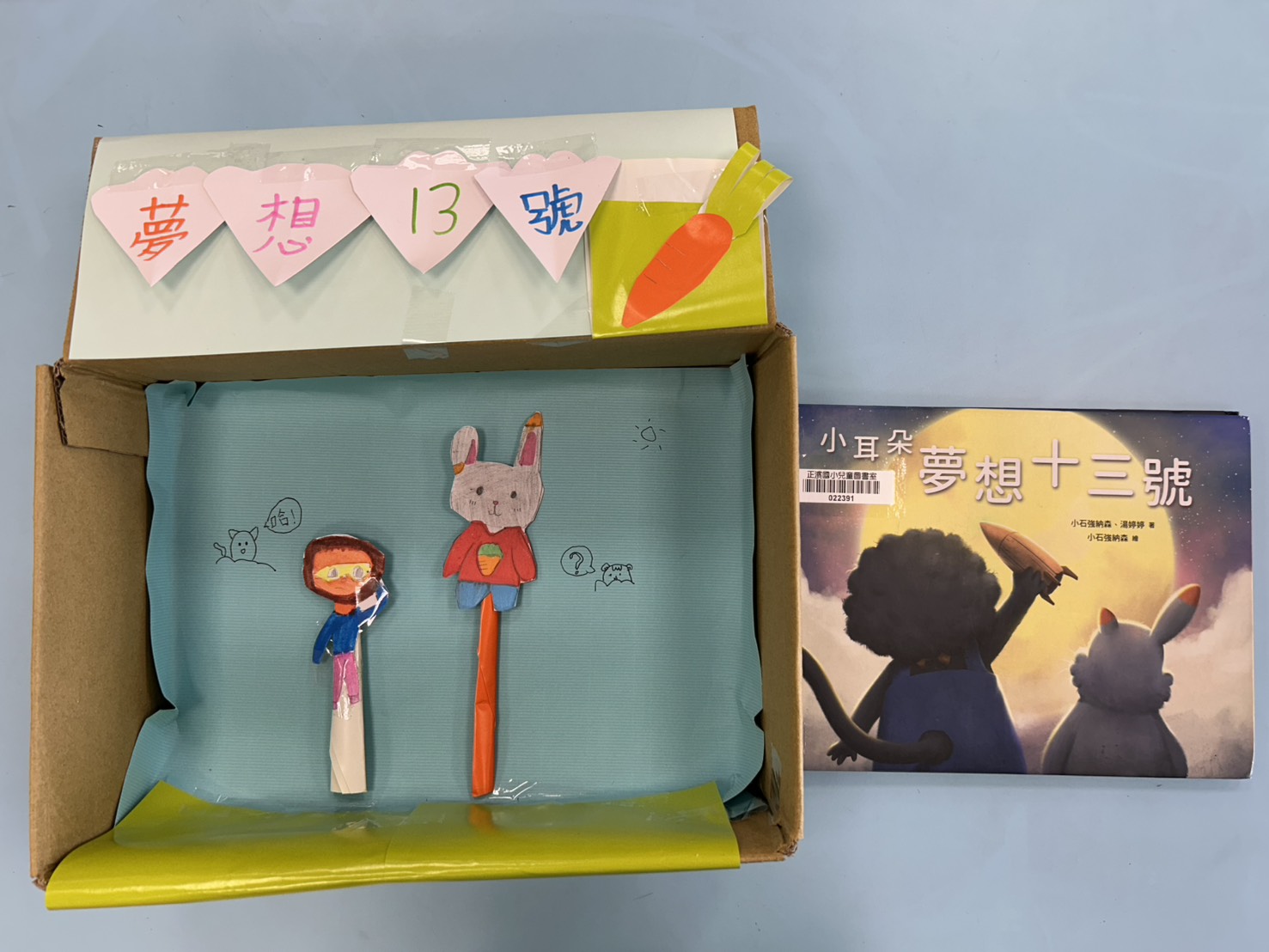 我用寄包裹後廢棄的紙盒子,做成小耳朵夢想十三號故事盒,再用回收紙片畫出小耳朵和他的好朋友,然後就可以說故事給大家聽了!