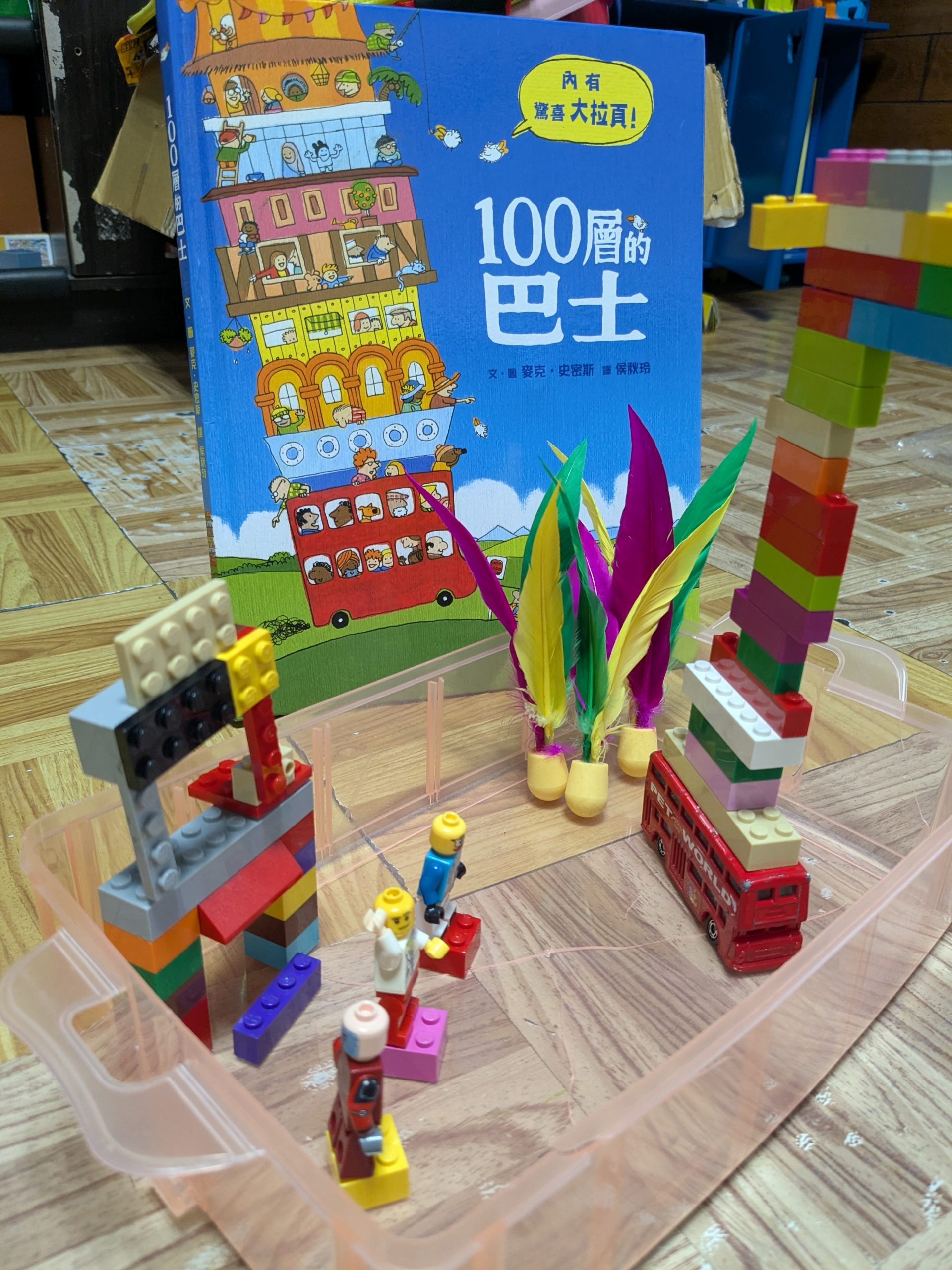 使用裂開的塑膠盒,利用樂高積木堆疊成好多層的巴士,公車站,用小人當想搭車的人,用板羽球當植物背景!來吧!跟著公車去旅行吧!