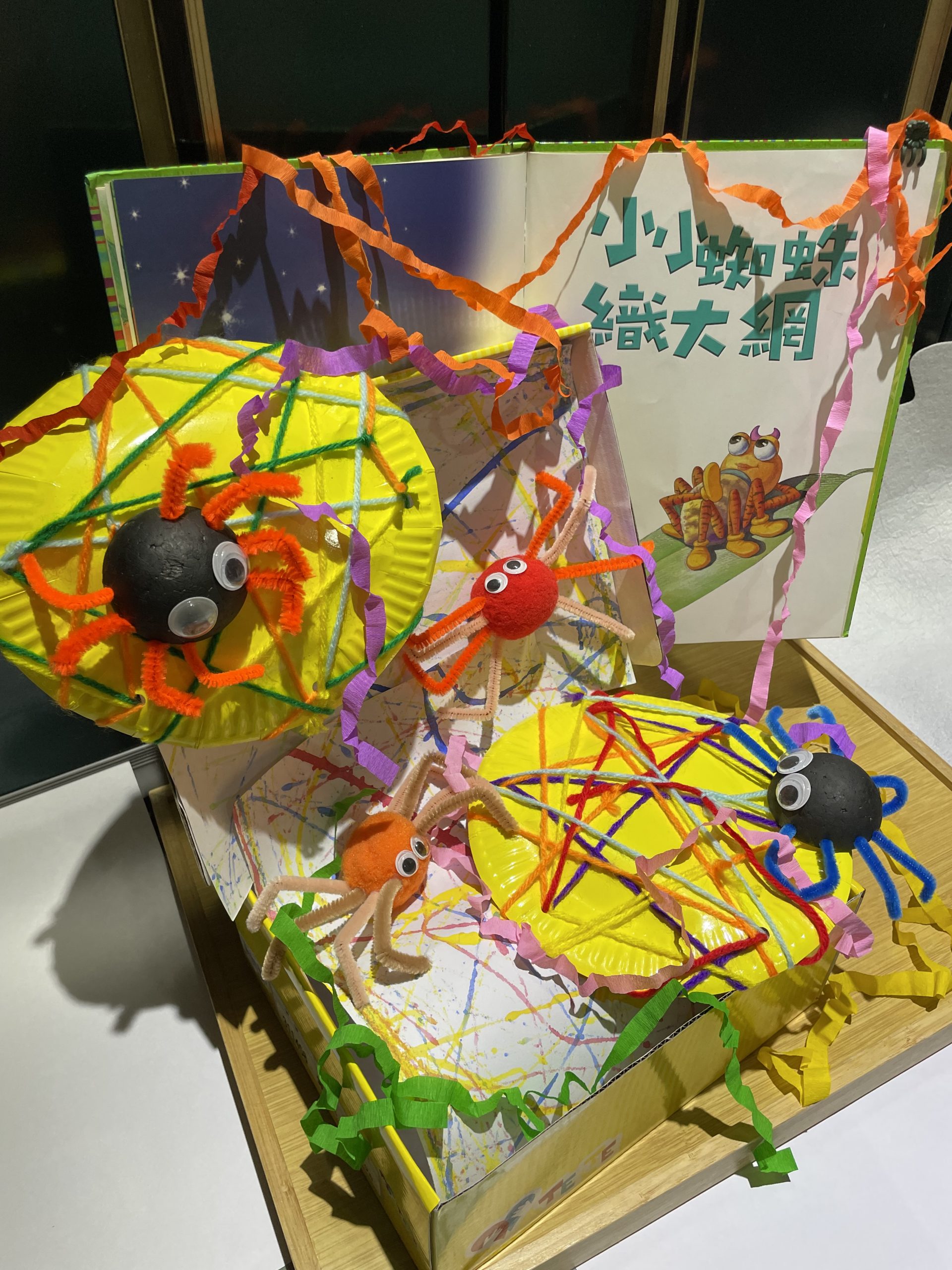 利用孩童紙鞋盒當基座,用水彩顏料沾彈珠在紙上滾出許多樣式的流線、使用棉線在紙盤上纏繞出不規則線網,再以毛球、保麗龍球、毛根製成可愛的蜘蛛。不同線條風格(顏料、棉線、紙彩帶)呈現出小小蜘蛛牠在學校學會織各式各樣美麗的網。